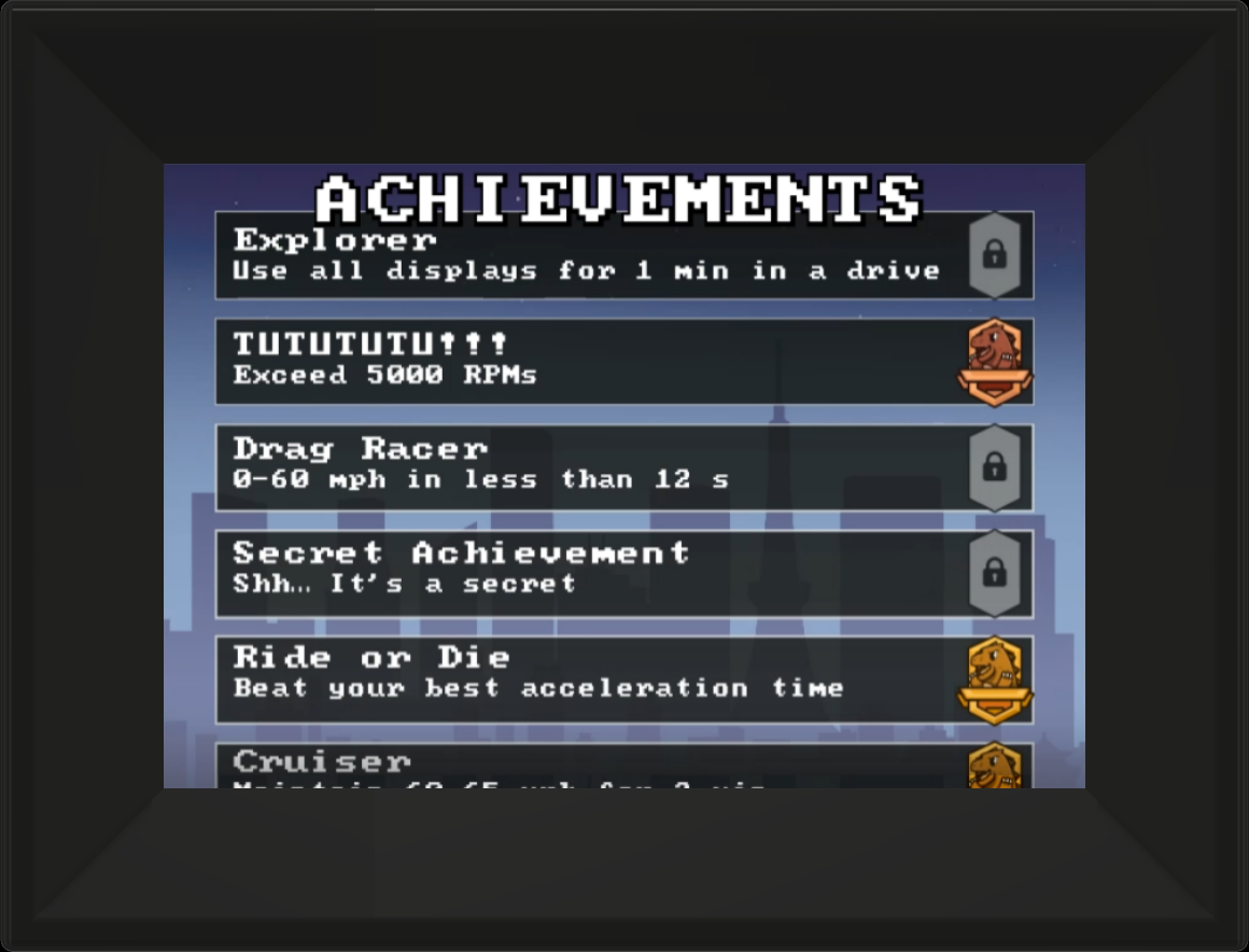 Follow the instructions on the Achievements Display to unlock achievements! Once you unlock all achievements, you'll be able to customize your car, turbo, and door on the Speed, RPM, and Fuel displays, respectively.